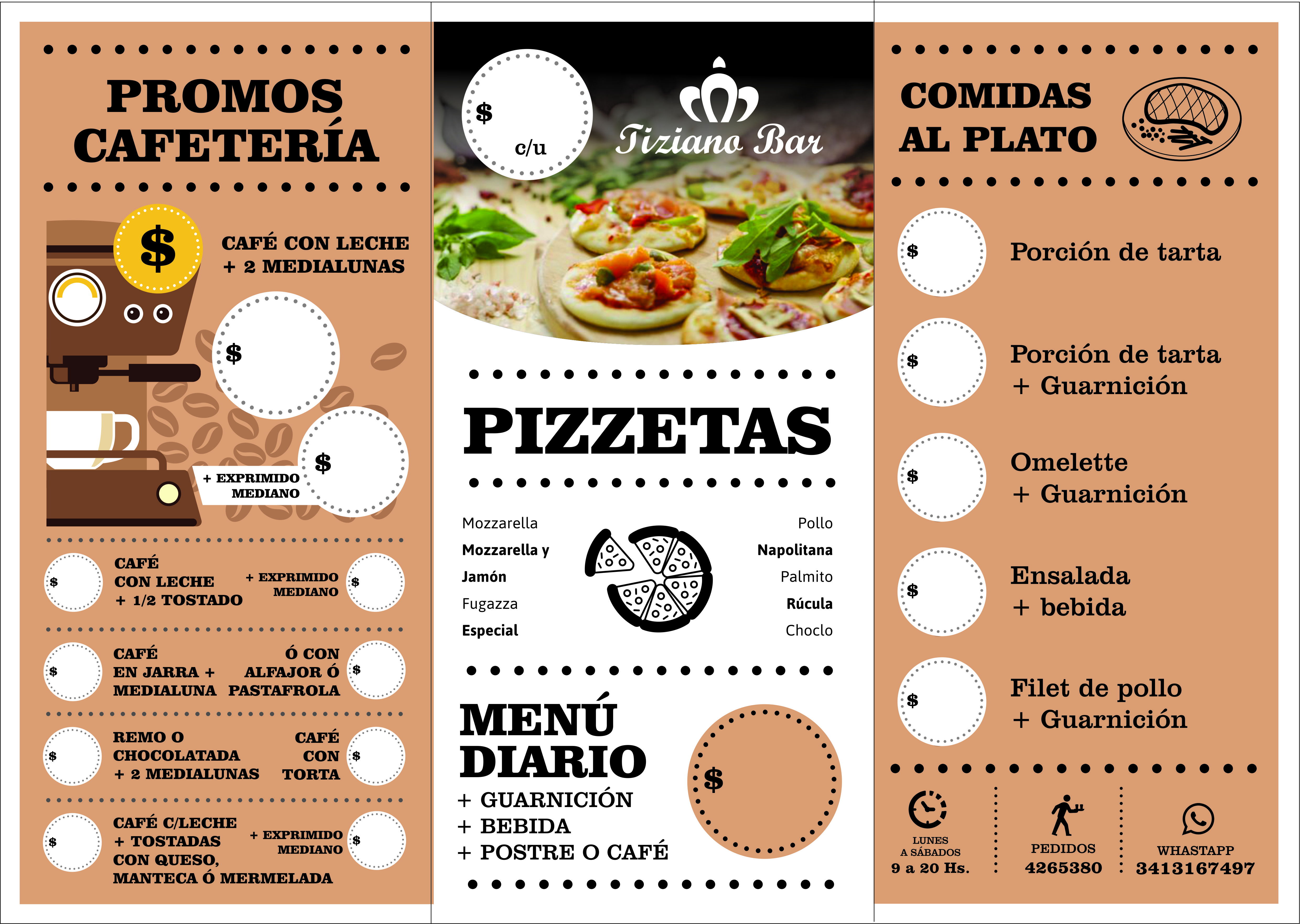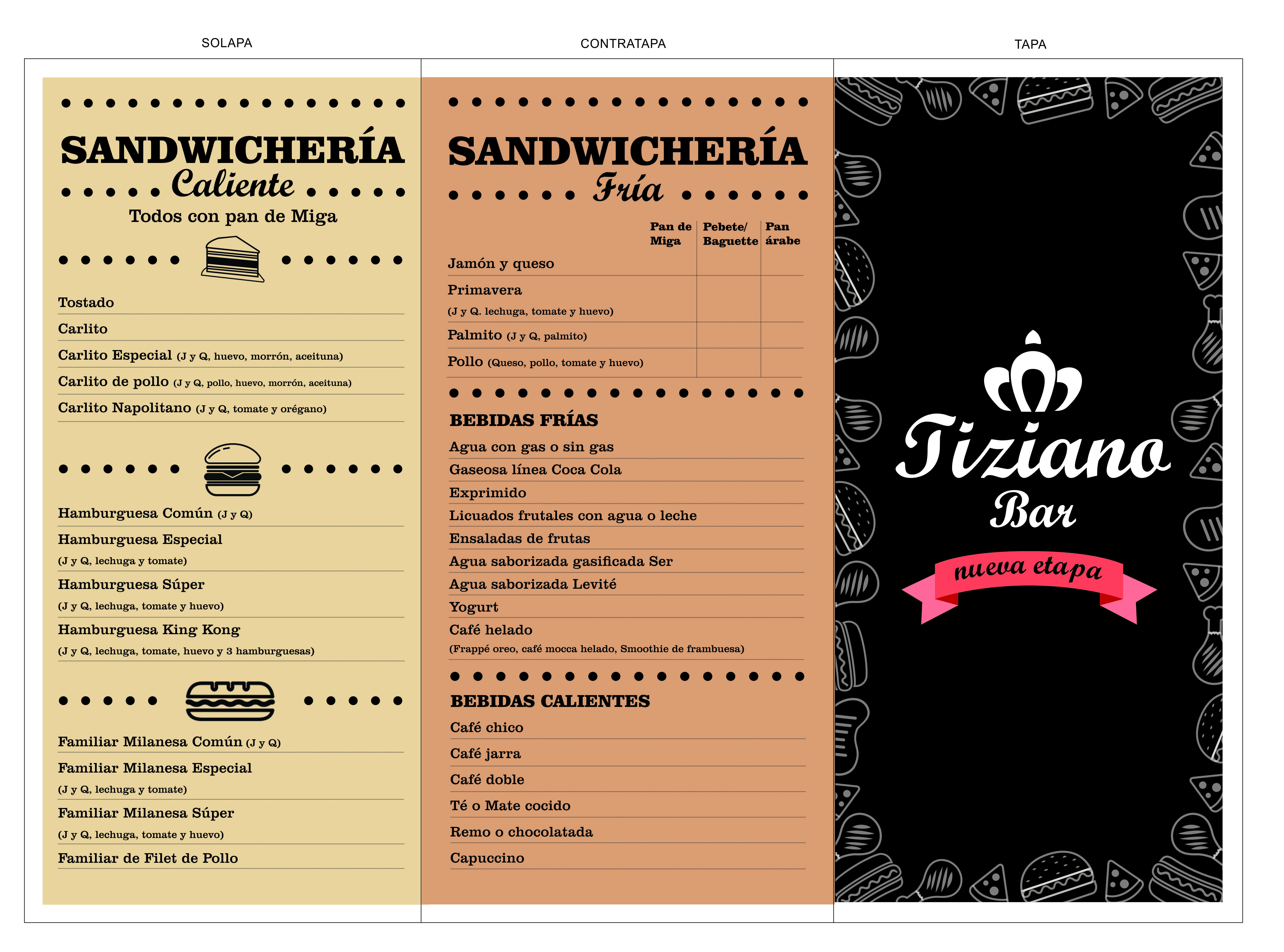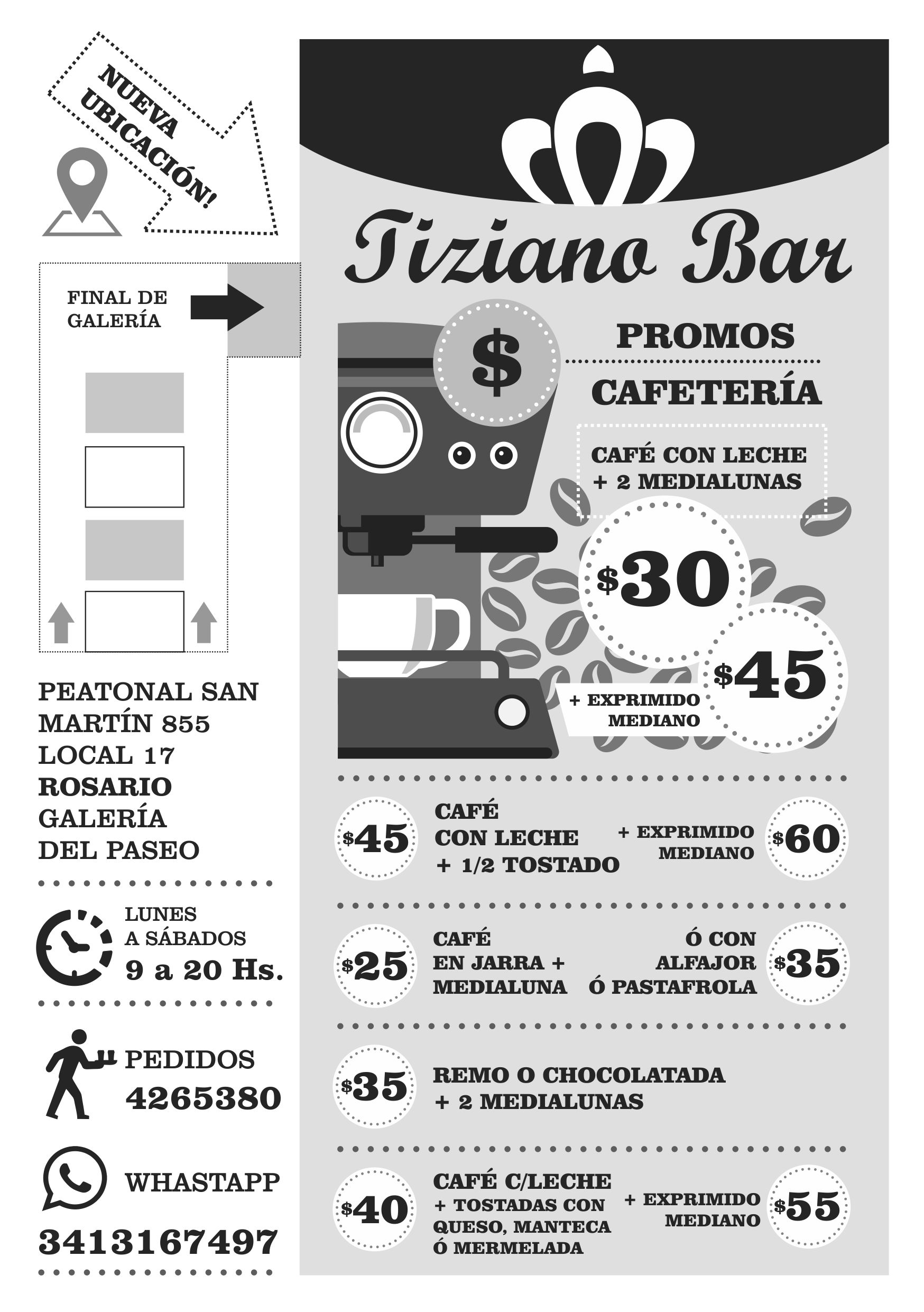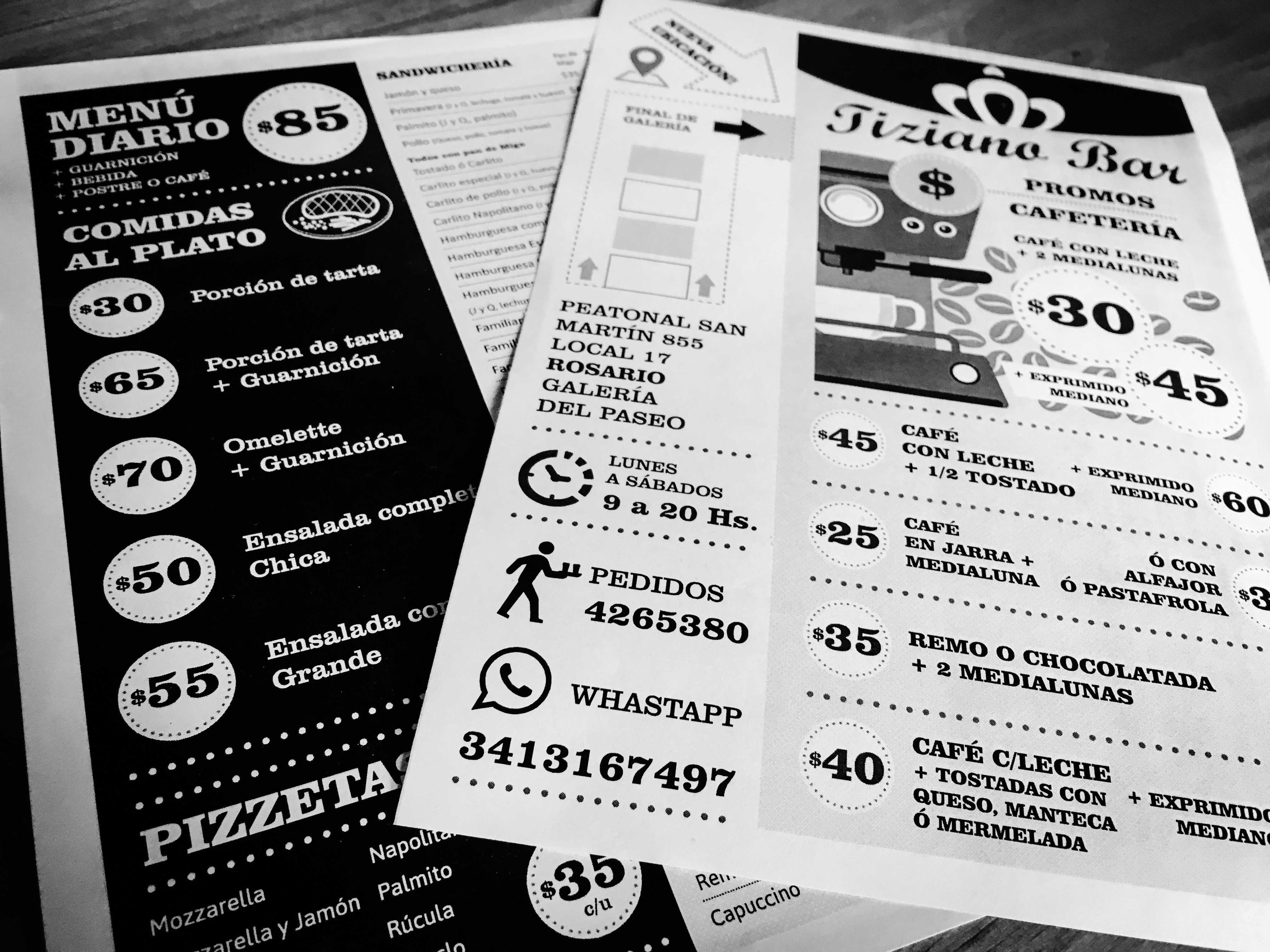 Diseñamos la folletería y menú del relanzamiento de Tiziano Bar, ubicado en la galería del Paseo de Rosario.