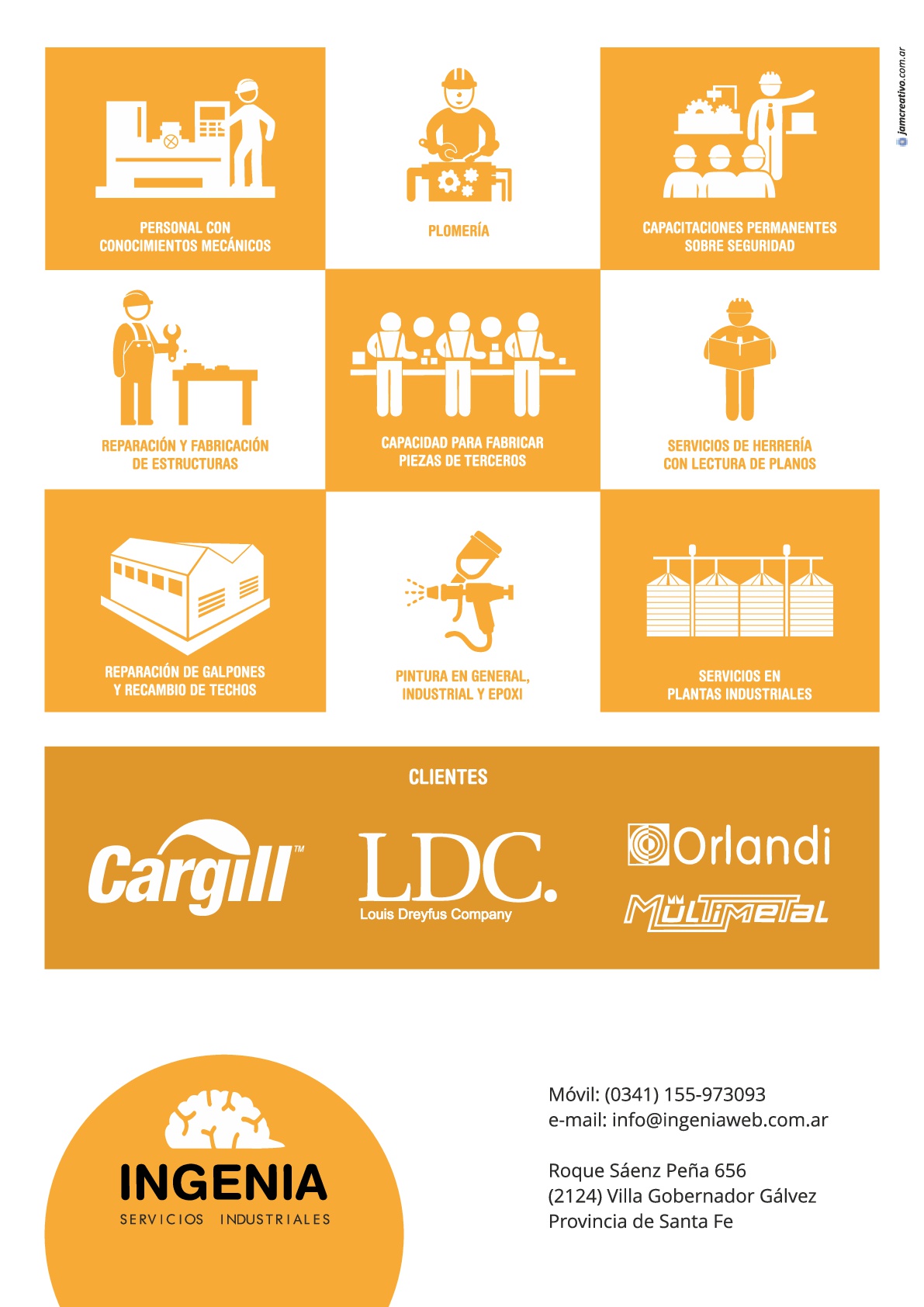 Desarrollamos la identidad visual de INGENIA Servicios Industriales, una pyme de Villa Gobernador Gálvez, Santa Fe que brinda servicios de herrería, montajes y fabricación de estructuras para cerealeras, puertos e industrias en general.