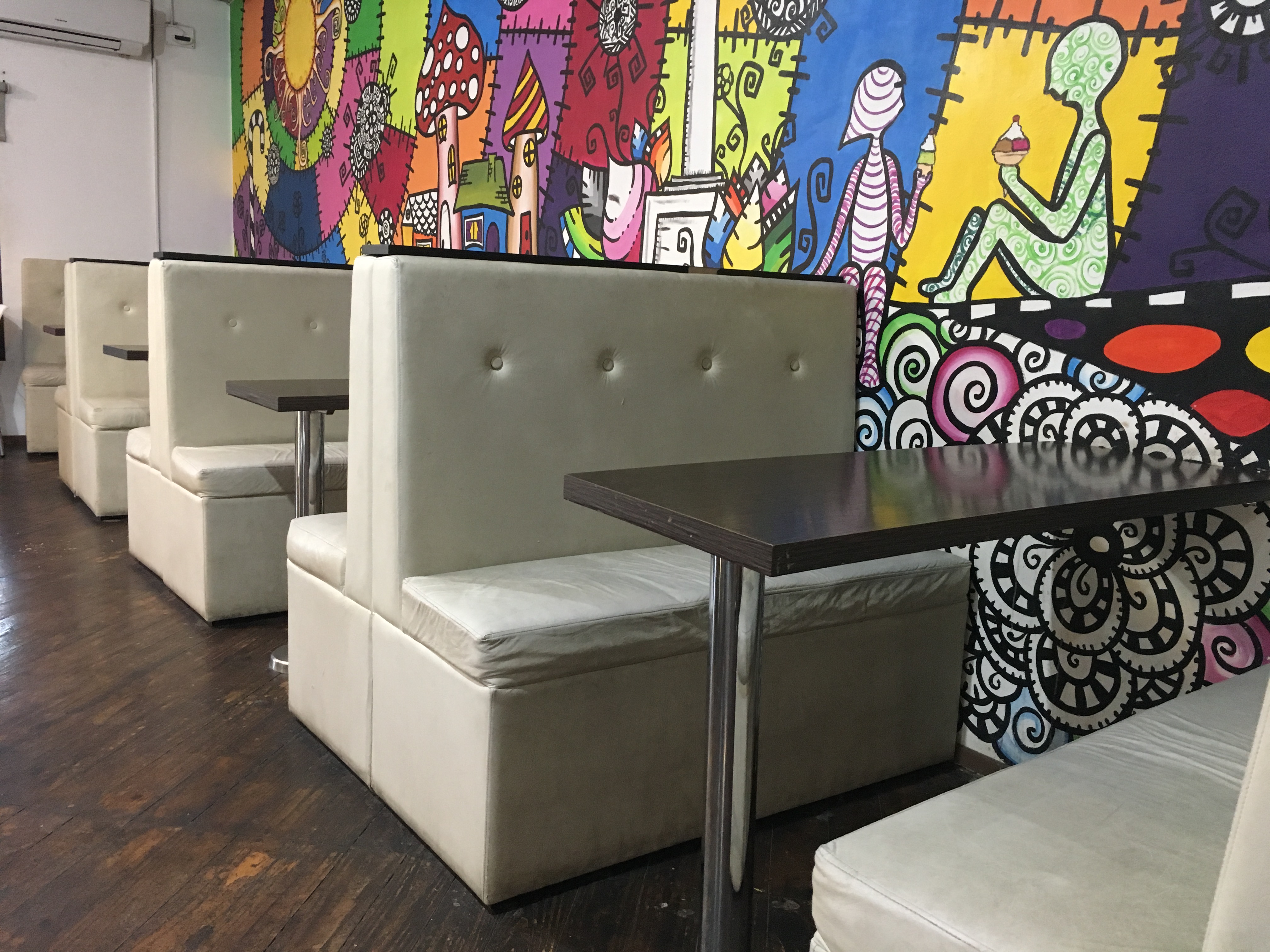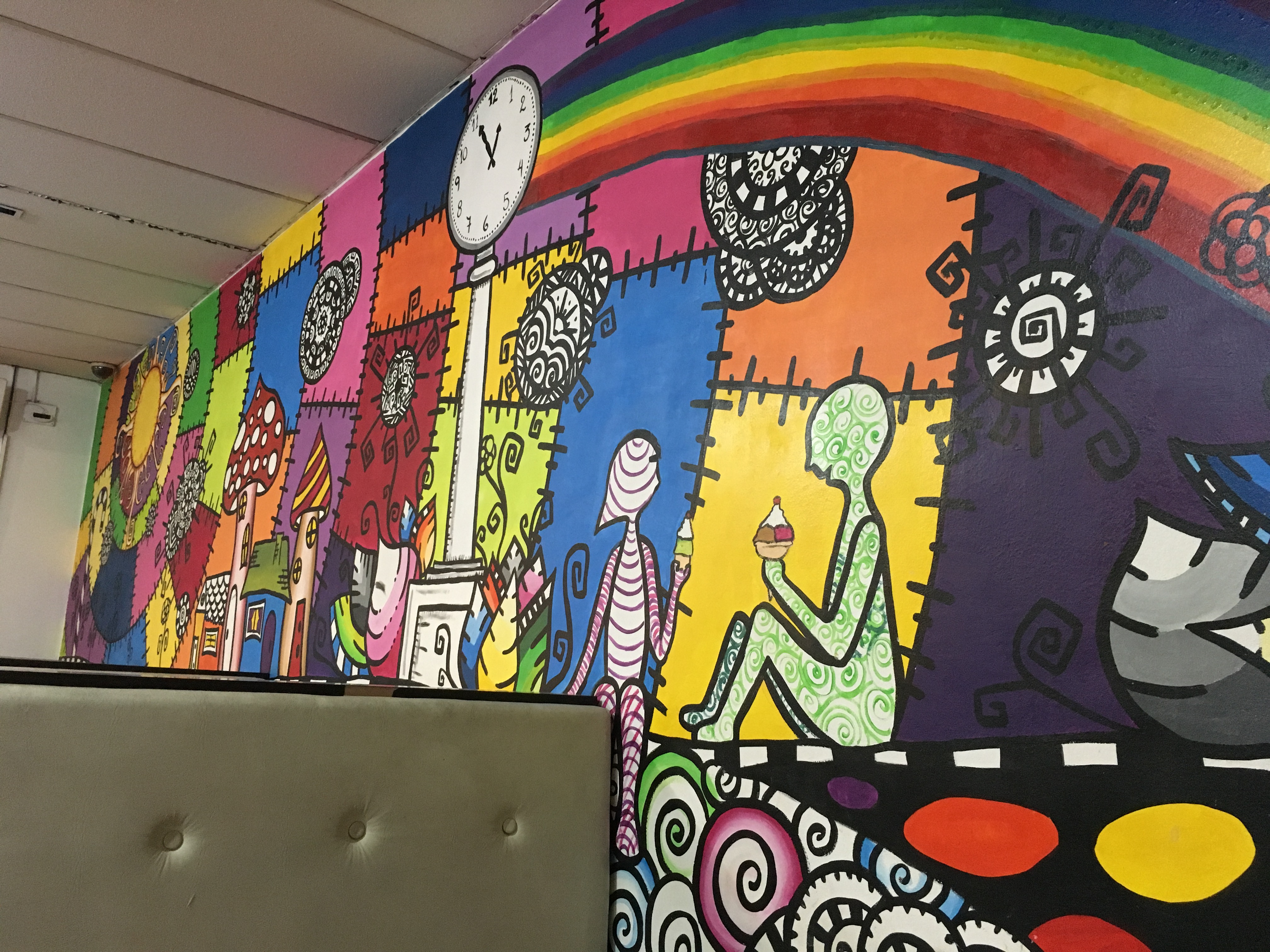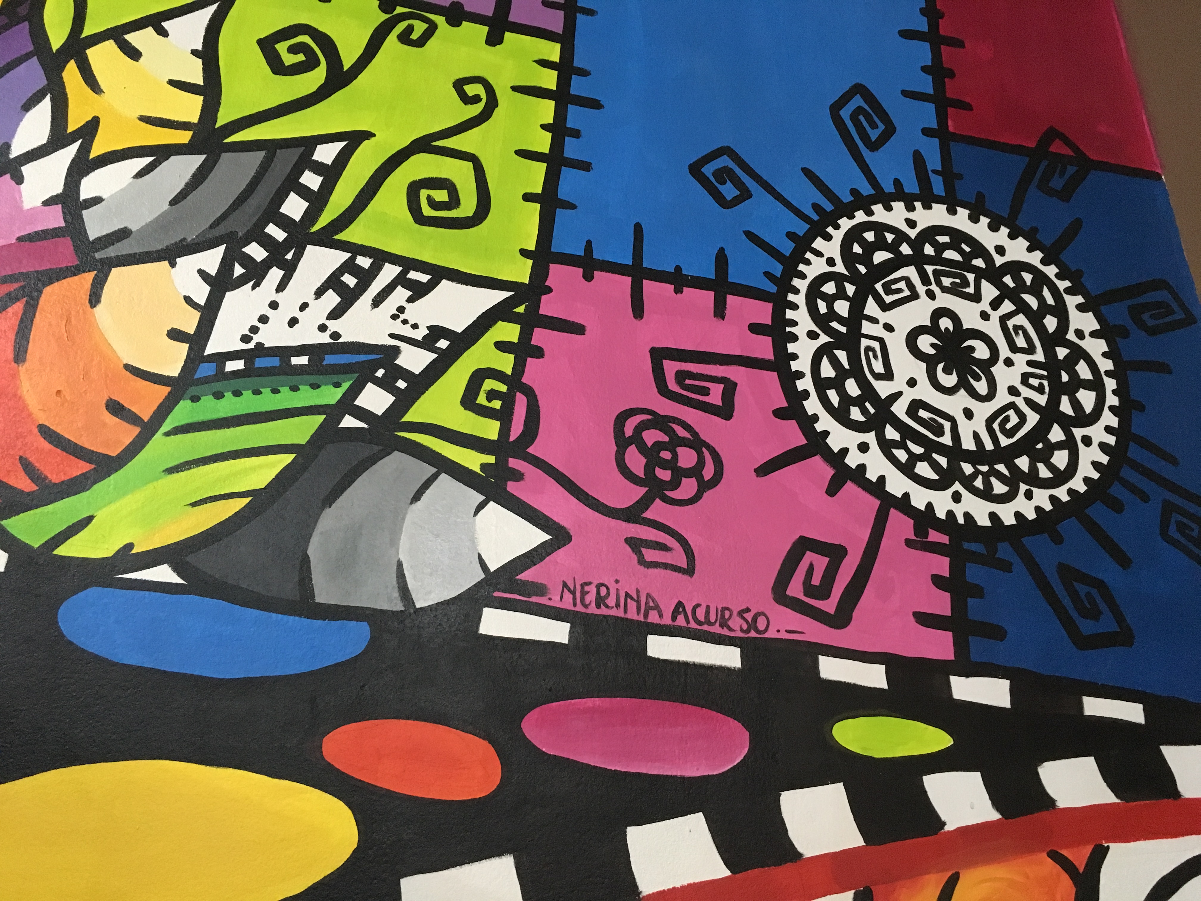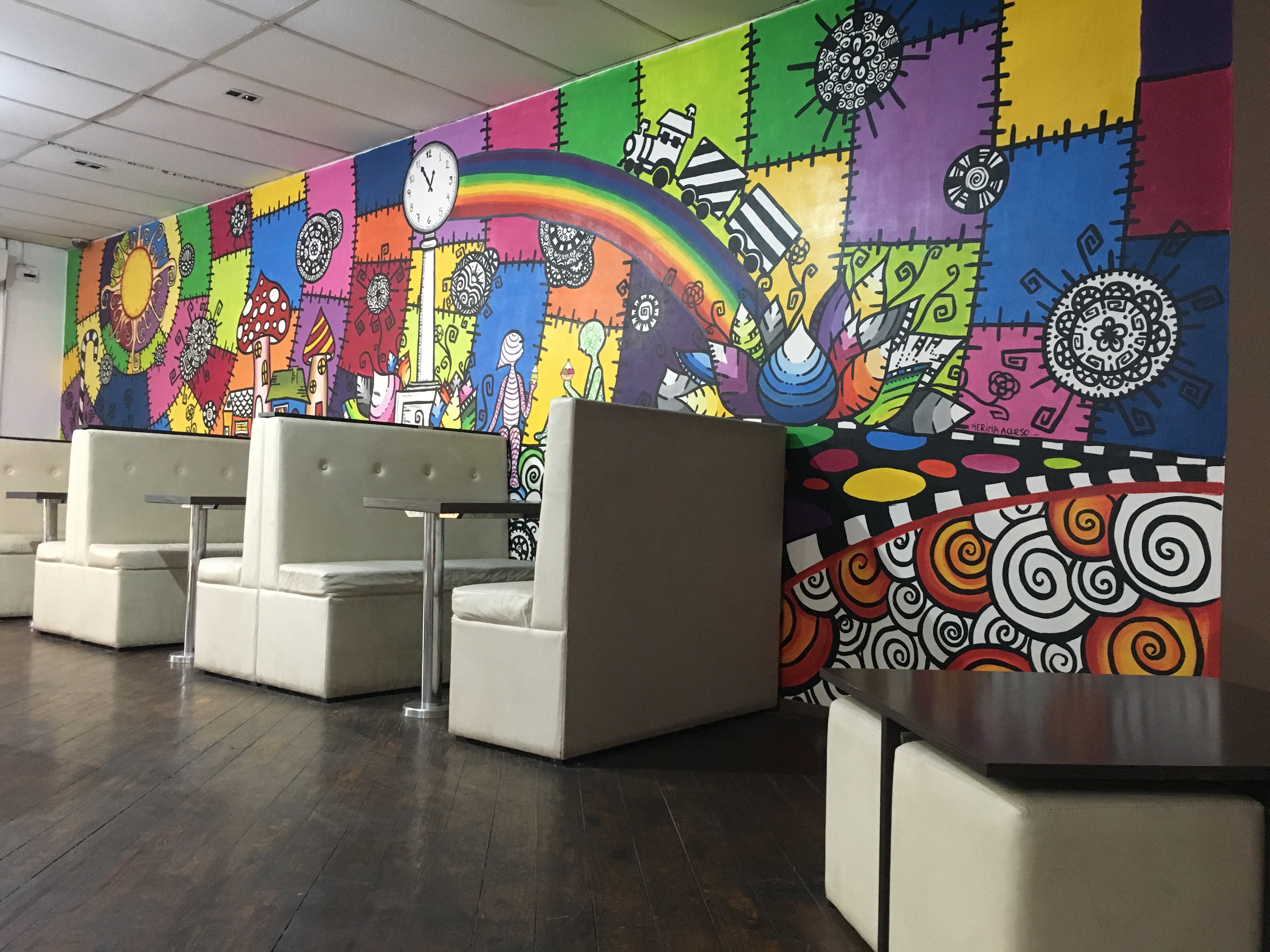 Uno de los espacios más llamativos es la pared más grande, donde queríamos que tuviera un toque original y artístico. Para eso contratamos a la artista plástica local, Nerina Acurso, que intervino la pared con su original estilo, incluyendo íconos locales, para que tenga una identidad con el barrio.