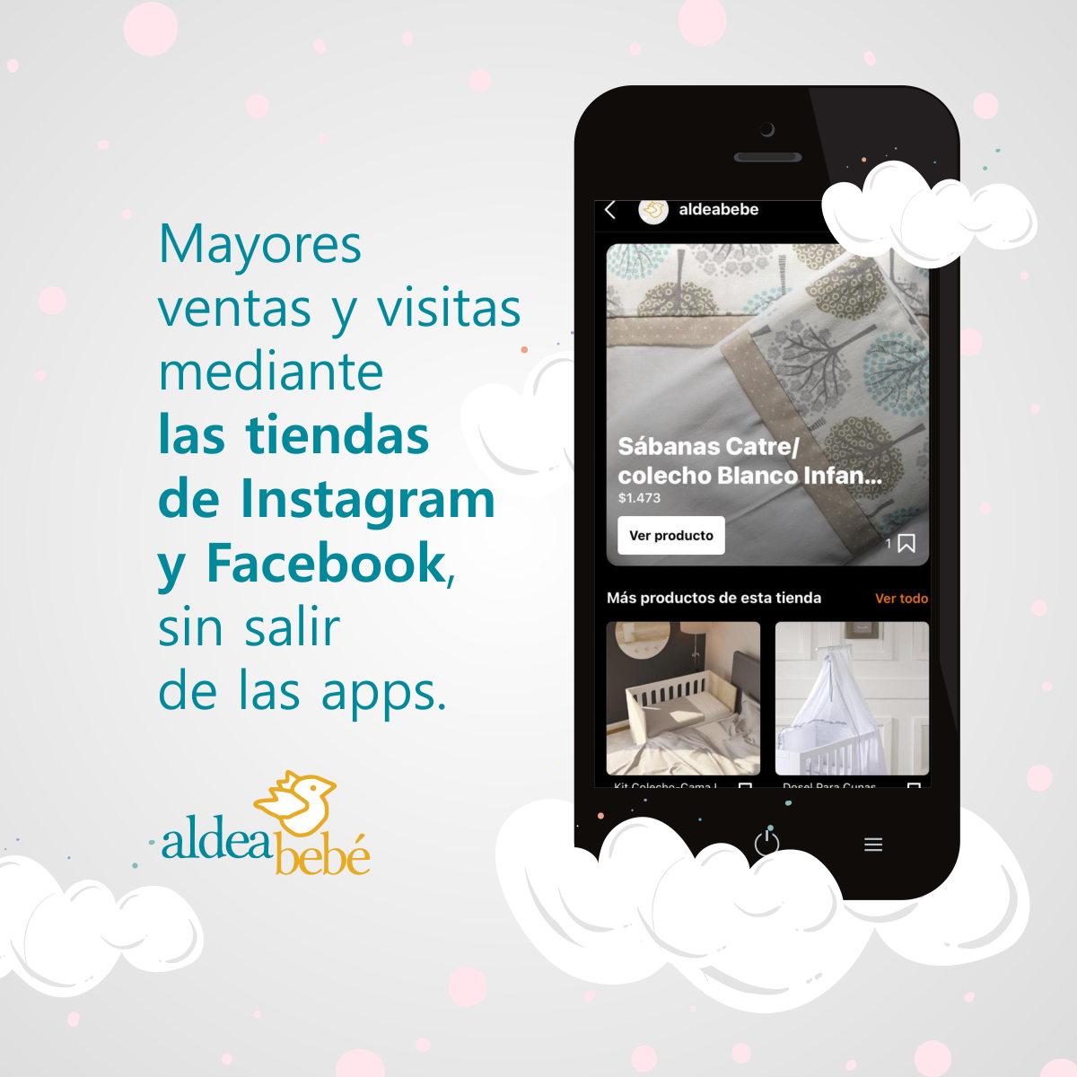 Mediante las tiendas de Instagram y Facebook, los usuarios recorren los productos de Aldea Bebé sin salir de las apps, pudiendo visualizar siempre los productos con sus descripciones y precios en tiempo real.