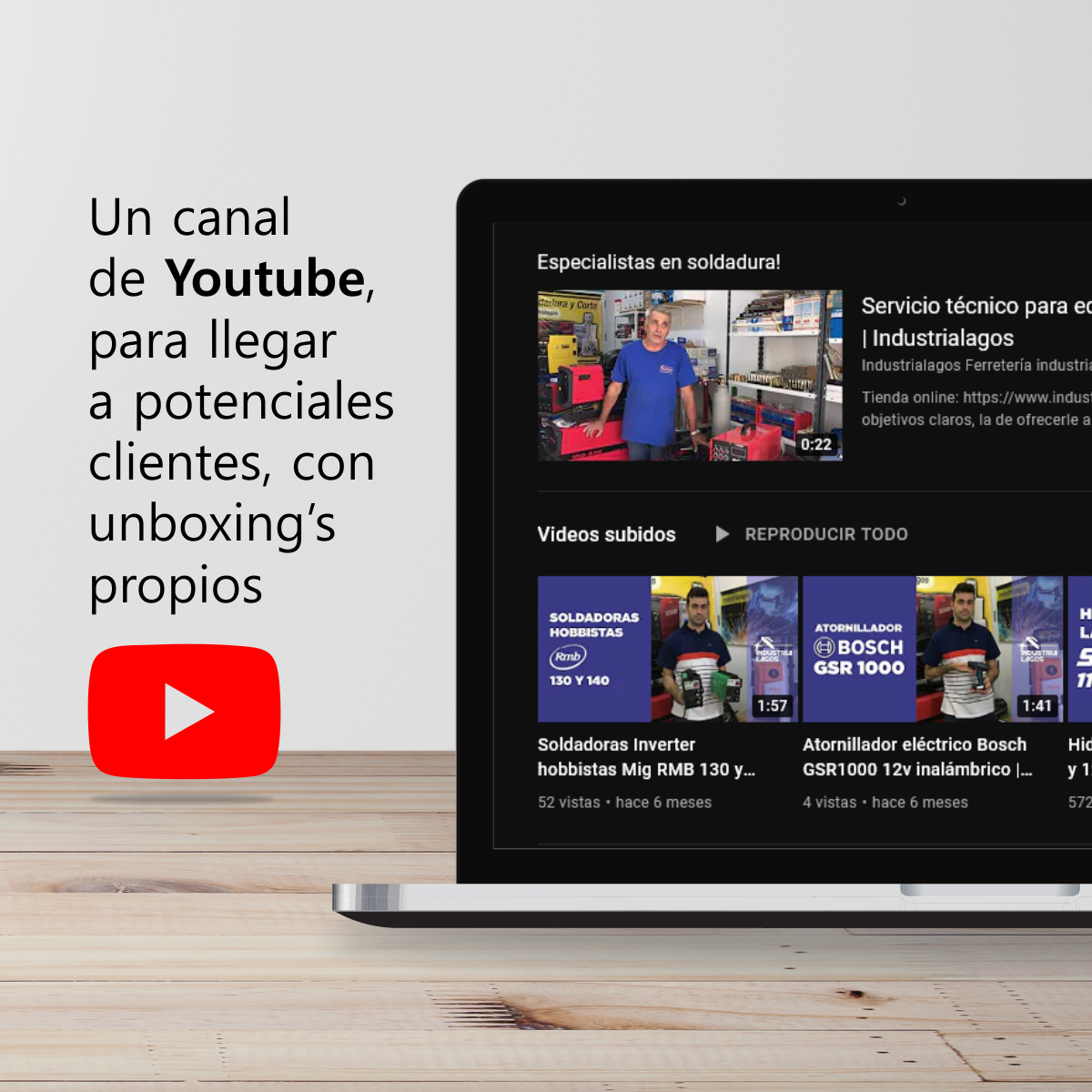 A su vez, acompañamos a nuestro cliente en la transición de la venta presencial hacia el ecommerce, diseñando su tienda online www.industrialagos.com.ar y canal de Youtube donde generamos contenidos audiovisuales como unboxing y tutoriales.